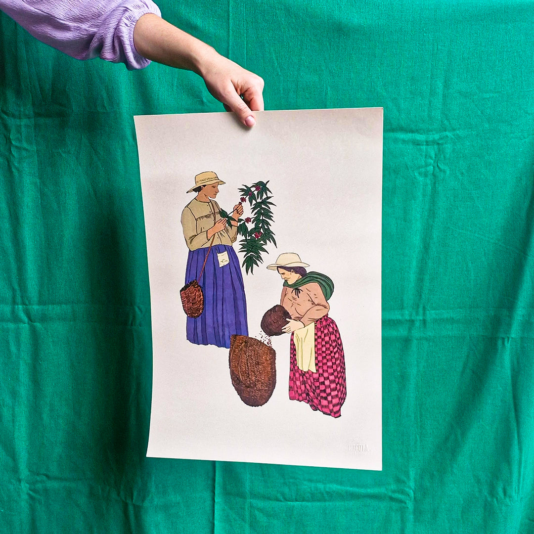 Las chapoleras son protagonistas de la cosecha del café en Colombia. Este afiche busca honrar su labor diaria con una escena que refleja belleza, fuerza y tradición. Ilustramos a estas mujeres en acción, entre canastos y cafetales, resaltando su papel vital en mantener vivo uno de los productos más emblemáticos del país.