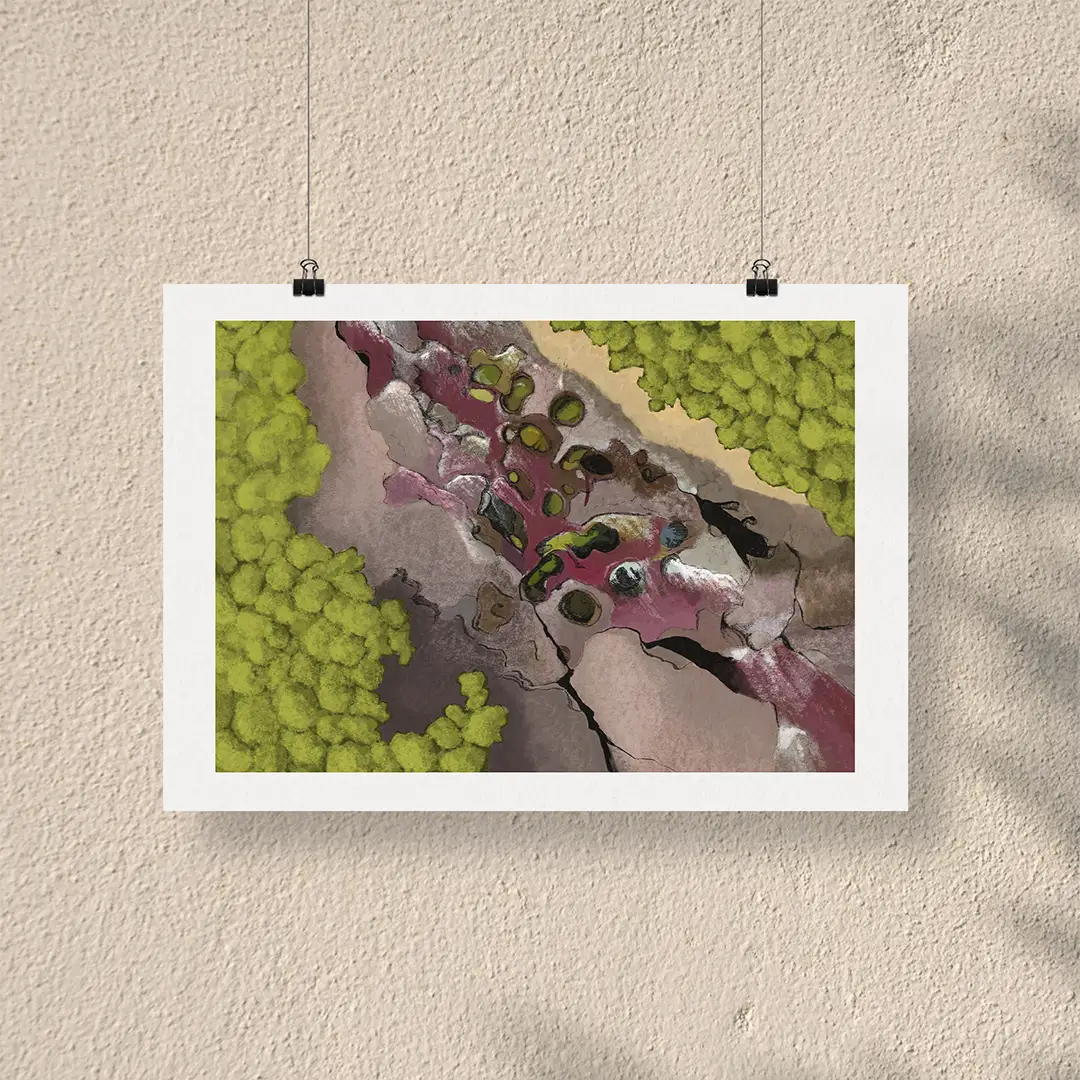 Este afiche de La Macarena rinde homenaje a uno de los tesoros ecológicos más asombrosos de Colombia. Ilustra la magia de Caño Cristales, el “río de los cinco colores”, y la unión única entre la Amazonía, la Orinoquía y los Andes, que convierte este parque en un epicentro de biodiversidad.